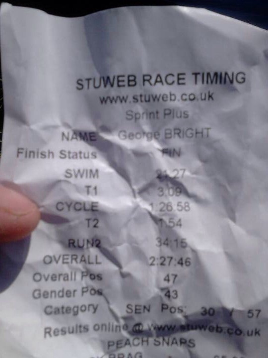 Saturday’s swim is listed as 21:27. While I still feel my swimming is holding me back from my destiny as the third Brownlee brother, I’m not too disappointed with this weekend. A large part of this is I’m not sure how accurate that 800m swim time is – the map of the route doesn’t add up to me, I don’t think the extra 50m over my last open water triathlon is enough to cause a 4 min difference, there was a hefty jaunt to the timing mat just outside transition, my pre-race breakfast wasn’t adequate, the stars had not aligned correctly and goats were not sacrificed in an auspicious manner, the water was bloody cold and I’m a wimp – point is, I hate to make excuses, but in this case I’m going to excuse myself. I actually quite impressed myself with my time for the relay, so for once, I am not going to be too hard on myself for this particular facet of my game.