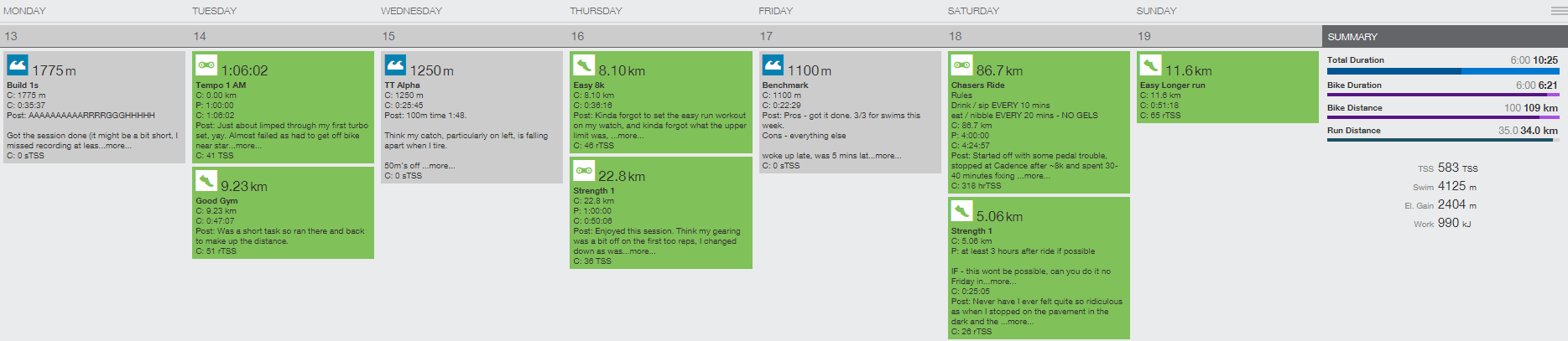 Week one of the new plan with Coach Tim has gone… well. Microgoals wise, I have hit every session – my new motto for this year is Just Get It Done. Stop finding excuses to bail out of stuff, just do it. As much as the microgoal thing is me giving me a little bit of slack here and there, I also need to kick back on with the discipline. I’m not going to manage every single session this year – no silly massive overly complex plans – but seeing as the last time I managed every session I had planned in a week was the last peak week before IM Kalmar, it seems fortuitous. If I can just take it week by week, I am hoping I can kick back into gear.