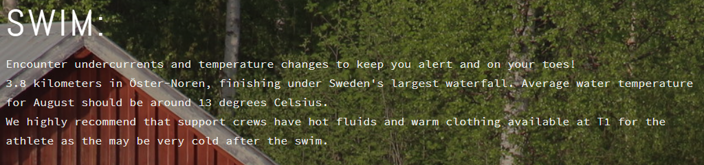 Then, at 5am, things get moving. For a guy who swum like the Hindenburg flew when I started writing this blog way back in 2015, 3.8k swims no longer scare me. What does slightly scare me is 3.8k swims in the Arctic. Well, not quite the Arctic; the area the race is located in is somewhere around 200-220 miles south of the Arctic circle. That’s still far closer to the ‘this is where shit gets COLD’ line than I ever fancied being. I do not deal with the cold well; and on that topic, in my experience, race organisers always lie and say the water is warmer than it is (unless you’re at Challenge Roth, where the sneaking suspicion is they lie in the other direction). I’m going 10 degrees, max. My support crew (who I will come on to) better have the hot chocolate ready. Or I may die.