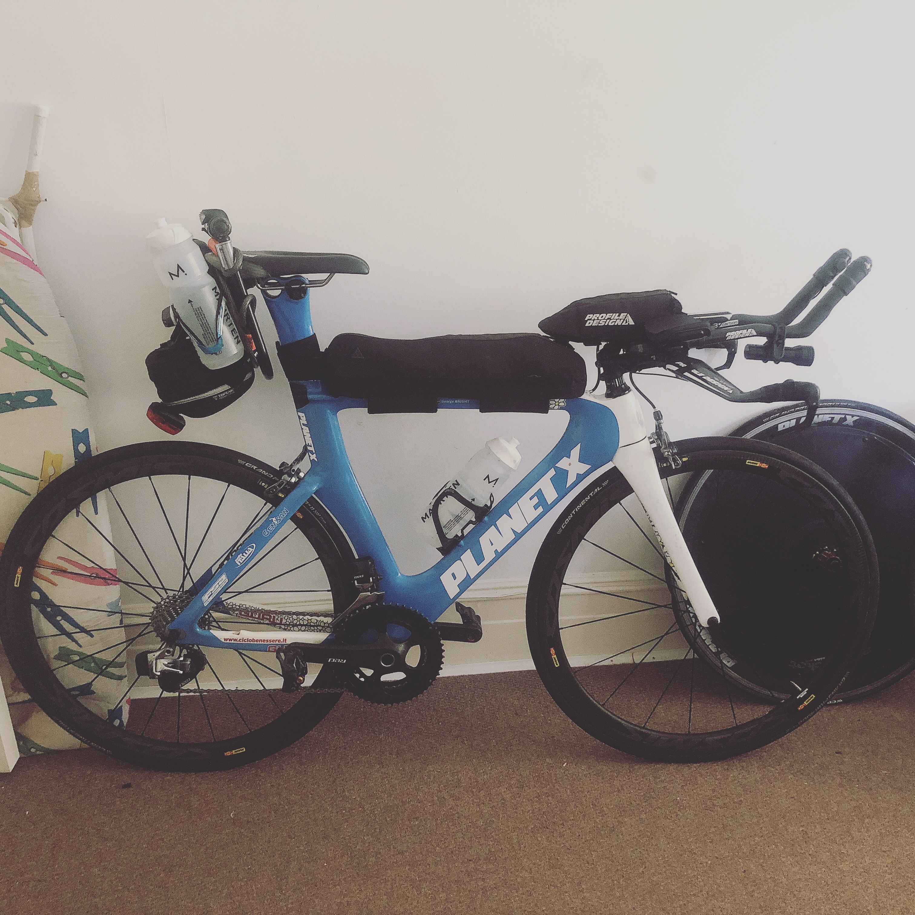As it turns out trying to fit bikepacking stuff designed for road bikes onto a TT frame is challenging. It’s probably more possible than I made it seem, but I guess the prospect of spending a few days with no shoes (well, none of the variety that don’t have carbon soles) or coat seemed less challenging at the time that a tired and stressed George trying to figure out how to secure a 6 litre saddlebag to a rear cage wing. I did manage to pack a spare set of cycling socks so I guess that’s a win for prioritising.